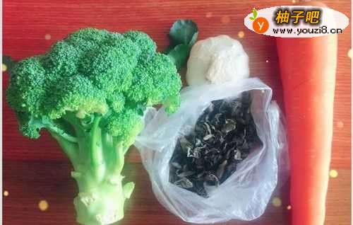 准备好所需食材:西兰花一个、胡萝卜一根、干木耳适量、大蒜头一个。西兰花不要选择朵太大的,因为虽然看着个头不大,但是掰下来之后还是蛮多的,西兰花选择稍微新鲜的会更好。