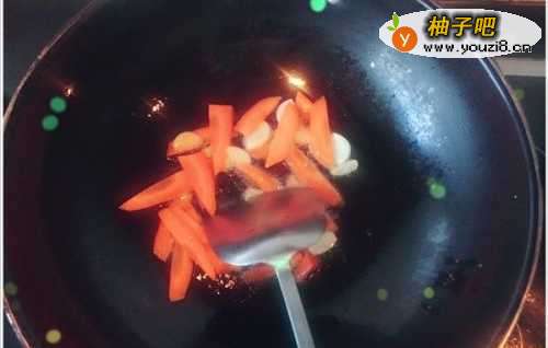 5然后放入事先准备好的胡萝卜片不断的翻炒,炒一会再放别的菜。因为我们都知道胡萝卜只有跟油充分接触了,再进入我们身体后其营养元素才能被我们的身体好好的吸收。所以,多炒一会胡萝卜没有错哦。