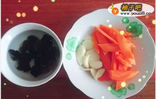 3处理其他配菜:干木耳用水泡发洗净后备用、大蒜瓣切片备用、胡萝卜切成小片备用。其实大蒜瓣也可以切成蒜末或者直接拍碎了用,但我个人比较懒就直接切成片来炒菜了,这个就看个人的爱好了。