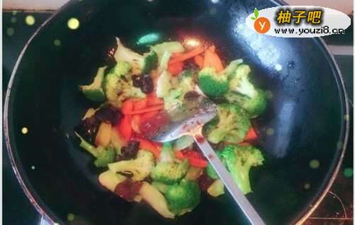 6接着倒入事先焯好水的西兰花和泡发好的黑木耳、倒入锅中翻炒一会。泡发好的木耳一定要再用清水清洗几遍,因为干木耳上也许会有很多的杂质,清洗过后食用起来更干净也更放心。