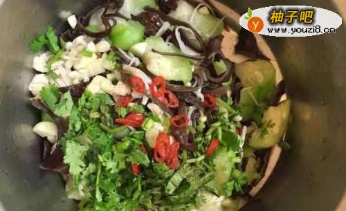 4加入盐、香油及白醋以及辣椒、蒜头、香菜调味即可。
