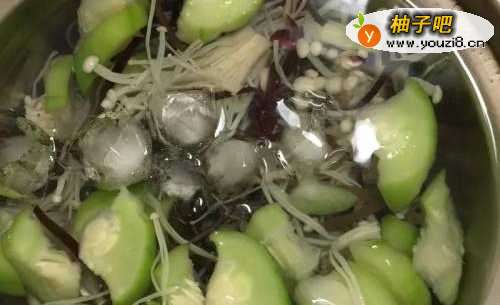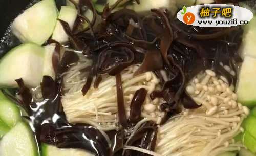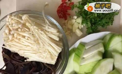 2煮一锅热水氽烫丝瓜、木耳以及金针菇,不要太过久,以免蔬菜都没了脆度。