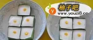 9最后再将椰浆倒入装满,最后点缀一粒粟米入冰箱冷藏20—30分钟即可。