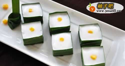 椰汁西米糕是一道泰式甜品,西米糕混合了椰香和草香味,口感软糯弹牙,很适合炎热的夏天食用。椰汁西米糕是将西米煮至透明状,经凉冻后盛入斑兰叶做成的小兜内,淋上椰浆即成。