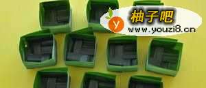 3将斑兰叶用剪刀横向剪至中间不断开,共剪五刀(五等分),将其折成小四方兜。