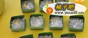 8将拌匀的西米装入斑兰叶剩器中(装至1/2处即可)。