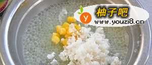7煮好的西米里面放入荸荠白碎、冰糖水、玉米粒搅拌均匀。
