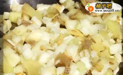 2倒一大匙油入平锅内,将蒜末、姜末及葱白爆香后,取出备用