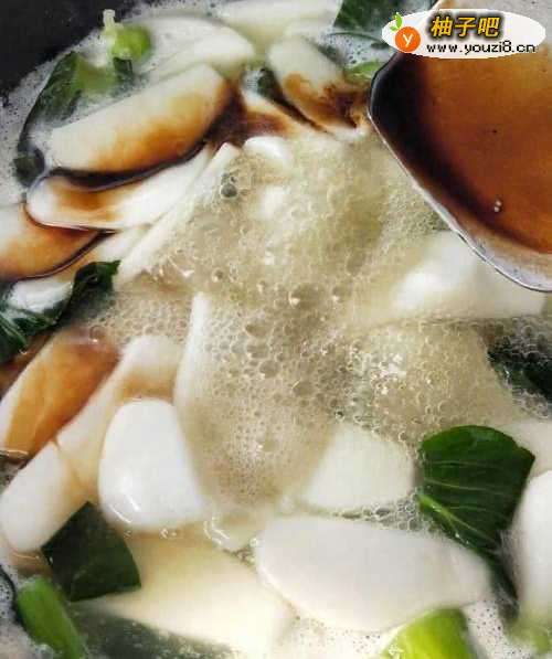 5继续加水,然后加入年糕,搅拌均匀让它煮