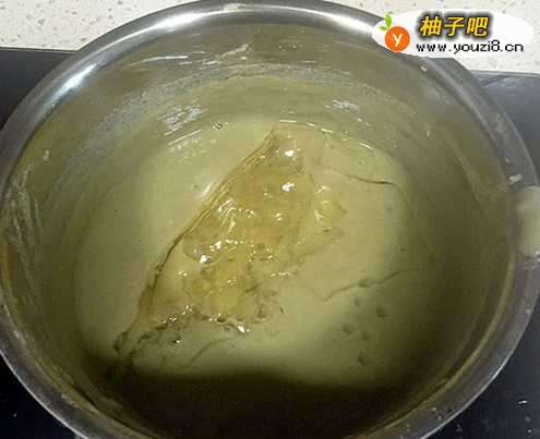 6大约60度时将吉利丁片放入锅中软化,并加入少许糖调味。