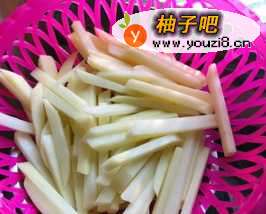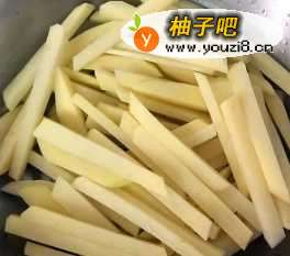 将土豆去皮后洗干净,然后切成条,粗细跟外面买来的薯条差不多即可。然后过水多洗几遍,把表面的淀粉洗掉。