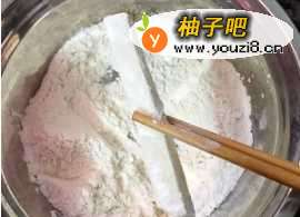 3取出一个干燥的面盆,倒入一碗面粉,然后再加入一勺的淀粉,搅拌均匀。