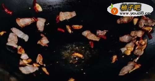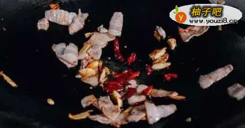 葱姜爆锅,然后下五花肉和干辣椒煸炒至五花肉出油。