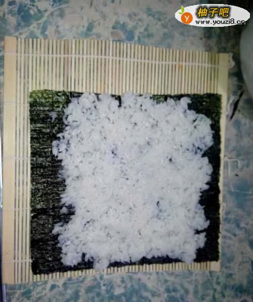 2铺上一层竹帘,放上一张寿司海苔。戴上一次性手套。把饭均匀地铺在海苔上。注意饭不宜过多,铺上一层就行,不然影响口感。海苔两头都要空出1.5到2厘米的空隙,便于卷寿司的进行。