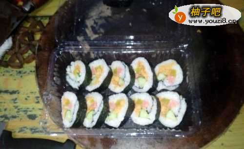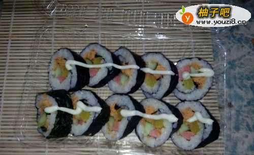 5最后一步,涂上沙拉酱或是番茄酱,这样,家常寿司就做好啦!是不是很简单呢,赶快动手做一做吧!
