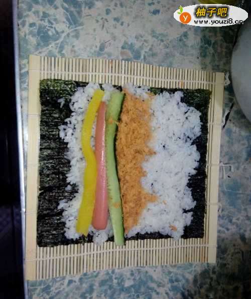 3拿出一条寿司萝卜,依照图示,依次放上寿司萝卜,火腿肠,黄瓜。然后铺上一层肉松。注意肉松要铺在米饭上。脱下一次性手套,开始卷寿司。卷起来后,注意借助珠帘用手掌的力量把寿司卷紧,多卷几遍。