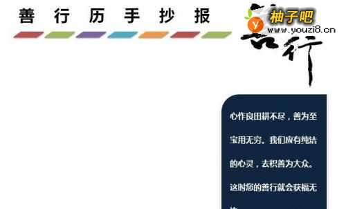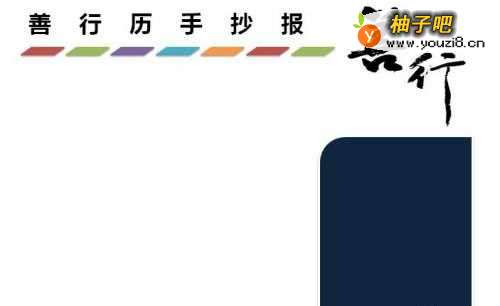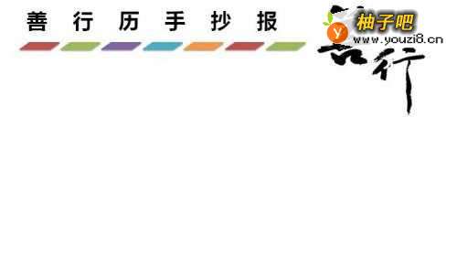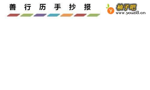 首先,用彩笔在白纸上,画出含有立体感小长方形框架并涂上颜色,在白纸的顶部靠左写上字:【善行历手抄报】的标题,如下图所示。