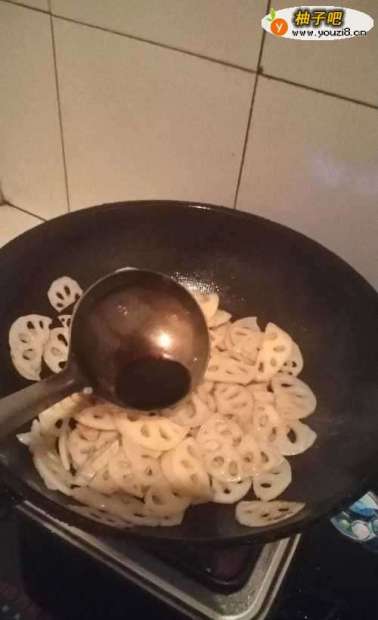 7再继续翻炒,并不时搅拌,让所有藕片都炒熟,最后出锅前加点食用盐