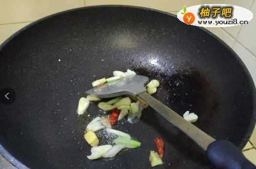 4将茄子起锅,加入油后放入蒜头、姜片、葱头、辣椒翻炒出香味,如图