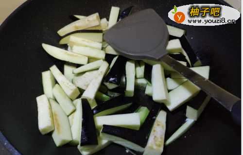 3锅里加入油后放入茄子,将茄子炒软,如图