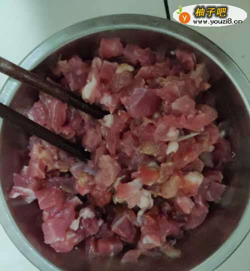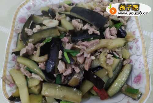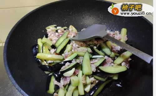 5加入猪肉翻炒一会后加入茄子翻炒,如图