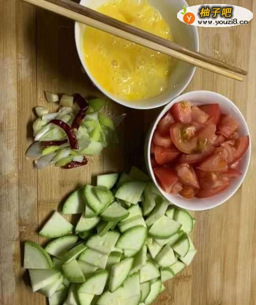鸡蛋打碎,西红柿切块,西葫芦切片