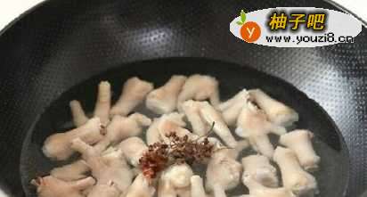 3令起锅入水,放入鸡爪,再依次放入花椒、大料、香叶。