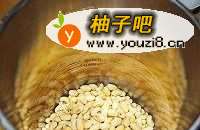2将泡好的黄豆装入豆浆机,加水至上下水位线之间,大约是1000克清水的样子。超过了水位线豆浆机会报警停止工作。没有加完的水继续留在水杯中,等会儿再加;