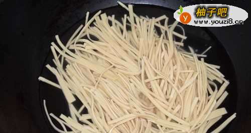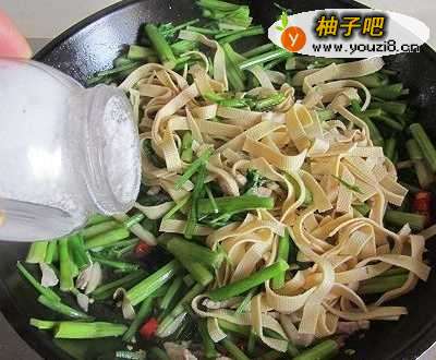 7再倒入焯熟的千张炒匀,加入盐,鸡精,生抽,炒至充分入味。