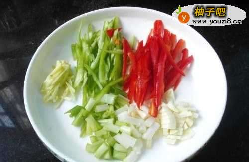 3葱,生姜,蒜头,洗净切碎,红椒,青椒洗净切成丝。