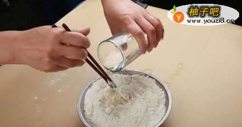 2取适量面粉与红薯泥混合,加入少许水,不断揉搓面团,直到红薯泥与面团融到一起