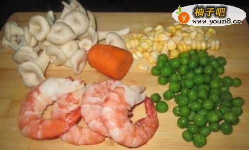 准备材料:小平菇、玉米、青豆、胡萝卜、海虾、姜片