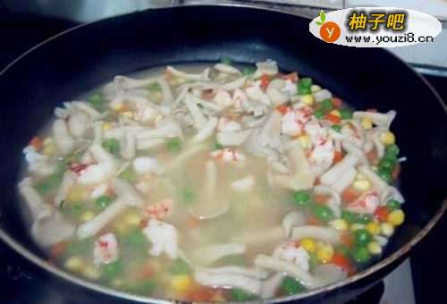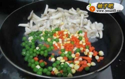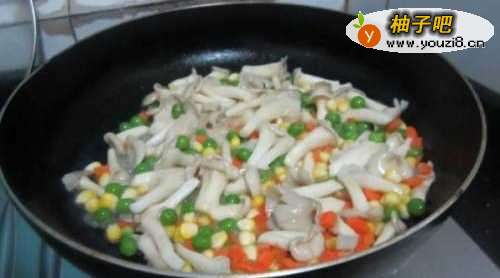 9然后放入玉米,胡萝卜,青豆一起炒下