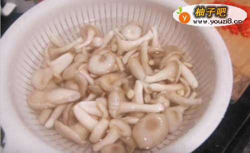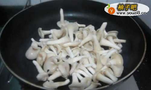 8锅里放些姜片 平菇翻炒下,菌菇较寒湿,这样可以减少湿气
