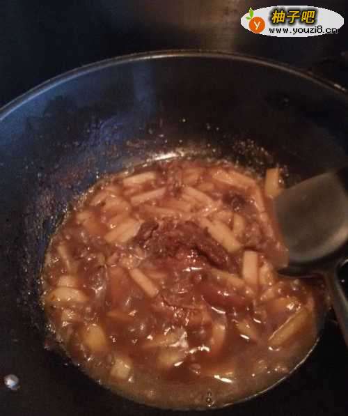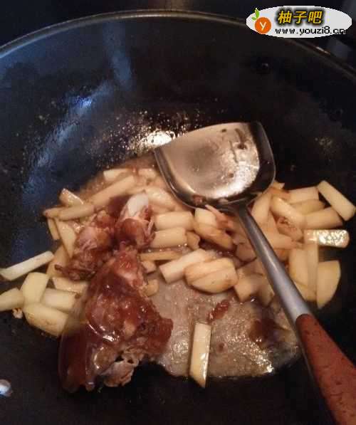 6土豆炒到八分熟时,将肘子肉和汤倒入锅中,一起炒。