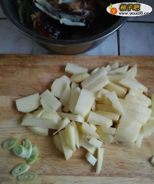 2用刀将土豆切成一寸长、一公分宽的条,把葱切成片。