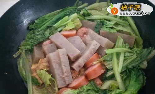 6接着放进去肉糕和香肠,还有咱们准备好的蔬菜。