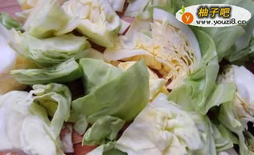 先将包菜用水泡一泡,然后把外皮的叶子剥掉,冲洗干净空水,切成约2*2厘米的小块。