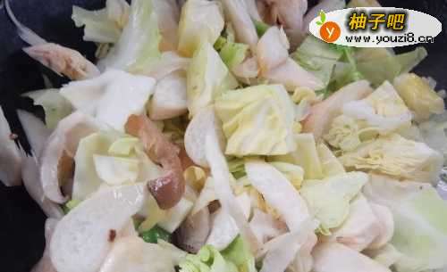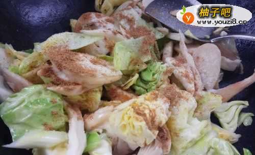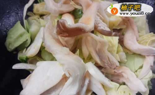 4将切好的包菜放入锅中,翻炒均匀后,放入适量的盐继续翻炒均匀,然后放入切好的杏鲍菇和平菇。