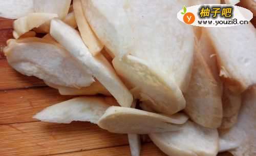 2将杏鲍菇洗干净,切成薄片,将平菇洗干净掰成小瓣,将葱剥好洗干净,切成小段,将姜块洗干净,切成姜丝。