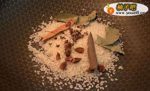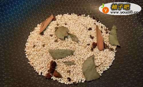 4趁着腌肉的时间,下面来炒一下蒸肉米粉,锅里放入大米、八角、桂皮、花椒、香叶、用小火进行炒制。