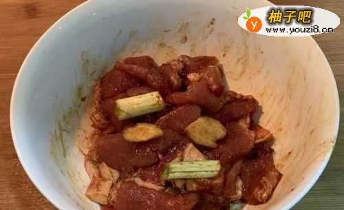 3再将切好的肉片里面加入食盐、鸡精、白糖、胡椒粉、豆瓣酱、豆腐乳、料酒、老抽、生抽、葱节、生姜片、用手将调料抓拌均匀,最后打入鸡蛋用筷子搅拌均匀,腌制20分钟。