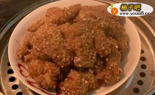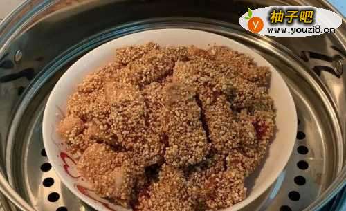 6把里面的料渣取出,稍微放凉一下在擀成粉粒状,在将擀好的米粉均匀的裹在肉片上,最后摆入盘中,放入蒸锅盖上锅盖,小火蒸制30钟。