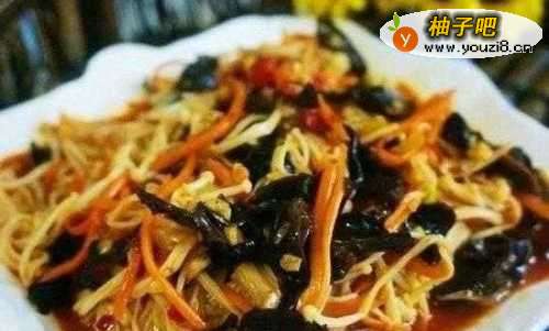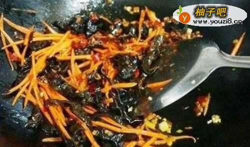 6把准备好的胡萝卜丝和木耳倒入锅里起翻炒一分钟;
