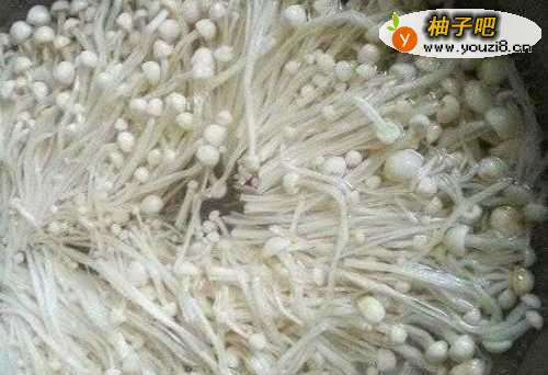3起锅烧水,水开后把事先去根洗净的金针菇倒入煮1分钟左右,捞起来控干备用;
