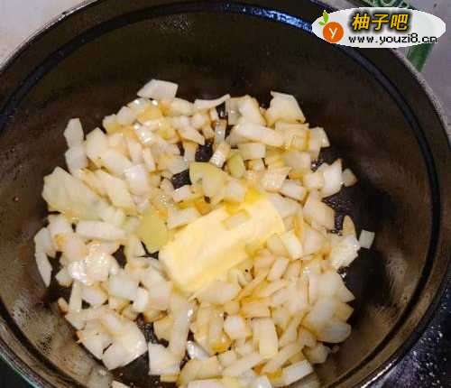 2原锅下洋葱和牛油爆炒至啡黄色。
