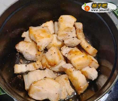 热锅下猪腩肉煎至金黄,煎的过程中加入适量的盐和黑胡椒,煎好的猪腩肉取出备用。