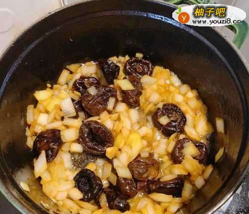 3再加入白酒和西梅干略煮一会,让酒精挥发。