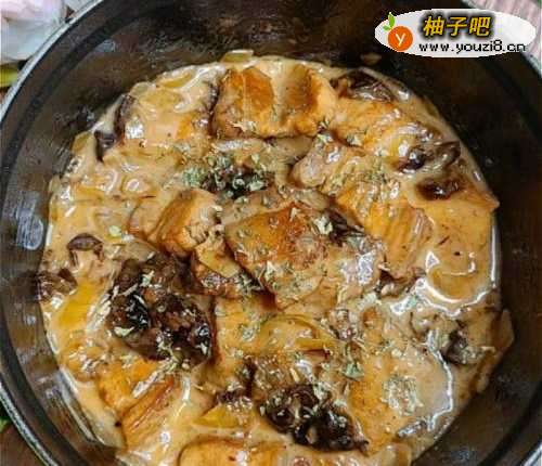 4加回已煎的猪腩肉并盖上锅盖以小火焖煮约半小时,之后打开盖以中火略煮至收汁,最后加入稀奶油拌匀便可。