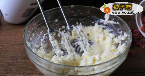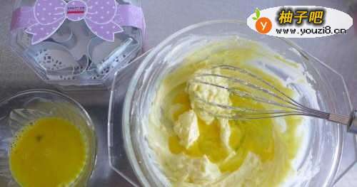 22、鸡蛋先打散成蛋液,分次少量加入黄油中,每次需迅速搅打至完全融合,方可继续加入,搅拌好的混合物呈乳膏状。